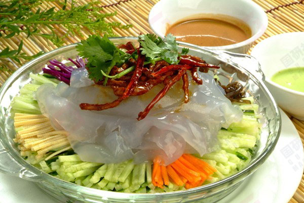 5.吃的時(shí)候?qū)⒗乃腥〕銮谐蓪挆l,放入備好的各種絲、炒好的肉絲和兌好的調(diào)料汁,再放入少許鹽拌勻就可以吃了,在飯店吃或者做宴客菜,就將所有的絲墊底,上面放拉皮,炒好的肉絲放到拉皮上,再澆上調(diào)料汁,吃的時(shí)候再拌勻就可以了