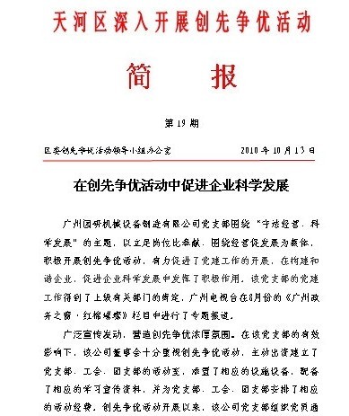 2010年10月13日,天河區(qū)區(qū)委區(qū)政府主辦的工作簡(jiǎn)報(bào)第19期專(zhuān)題報(bào)道了我司黨支部在創(chuàng)先爭(zhēng)優(yōu)活動(dòng)中促進(jìn)企業(yè)科學(xué)發(fā)展的事跡。