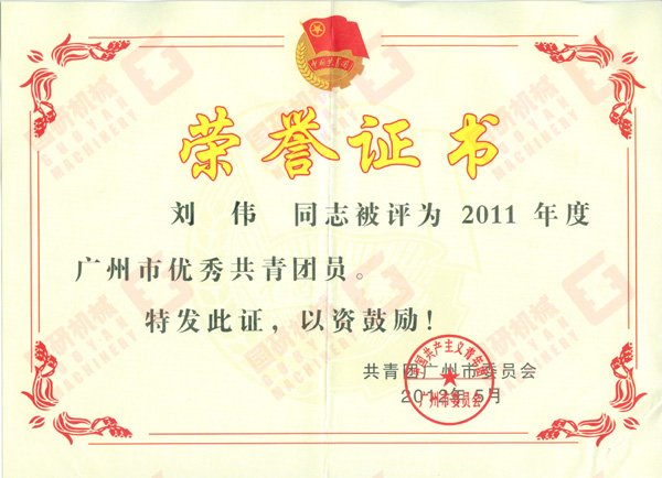 2012年6月,國(guó)研機(jī)械公司劉偉同志被共青團(tuán)廣州市委員會(huì)評(píng)為“2011年度廣州市優(yōu)秀共青團(tuán)員”。